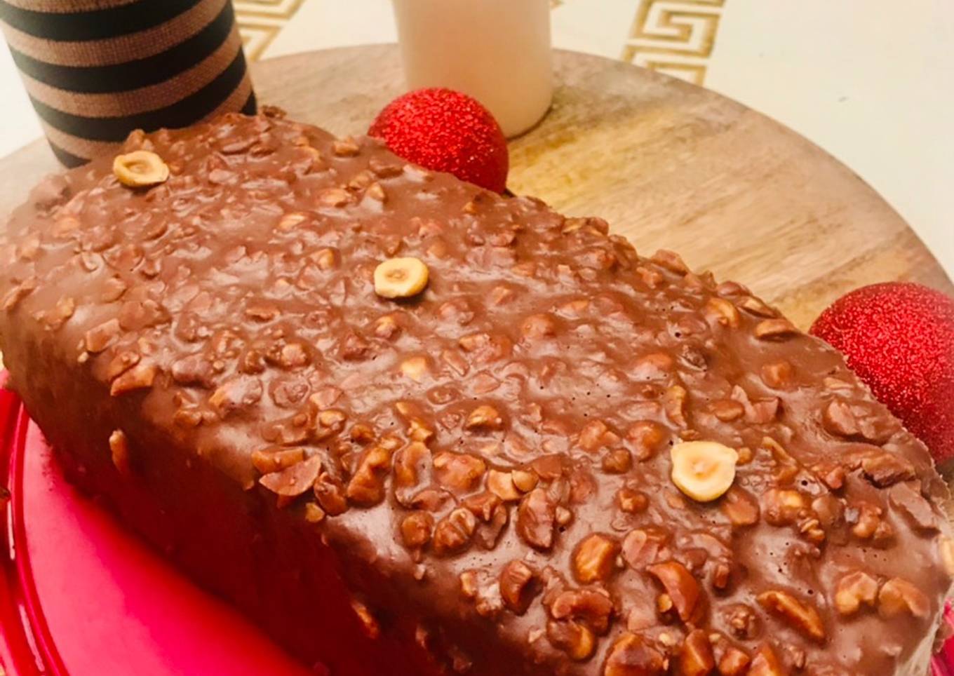 Une association de génoise au chocolat , noix, crème chantilly au praliné et glaçage rocher