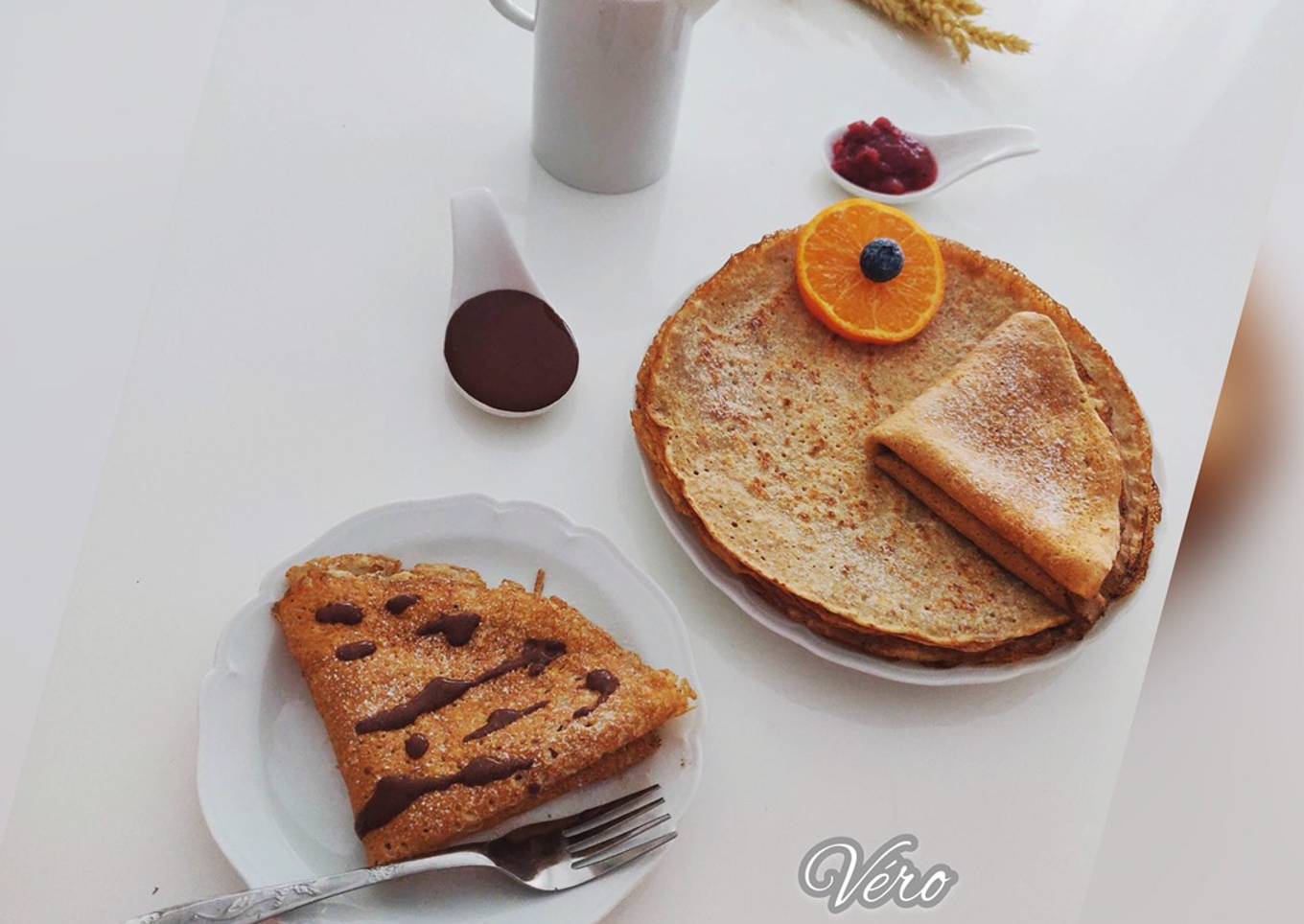- Chauffer une poêle à feu vif, sprayer d’huile. Si la pâte est trop épaisse, rajouter un peu de jus d’orange ou d’eau. Cuire les crêpes de chaque côté…….